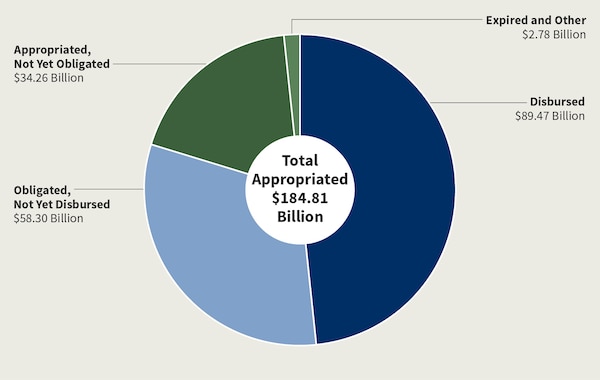 - $34.3B in appropriations for the Ukraine response remain available for obligation, most of which will replenish DoD weapons and equipment donated to Ukraine.